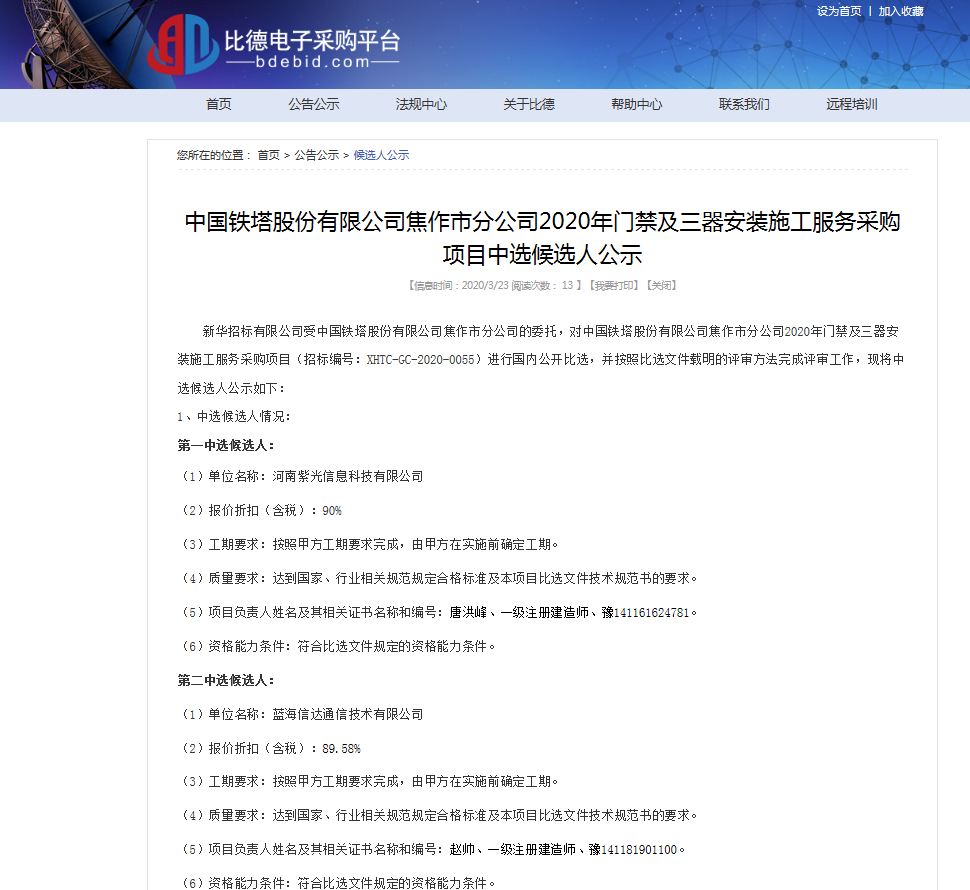 【喜讯】我司中标中国铁塔某市分公司2020年门禁及三器安装施工项目