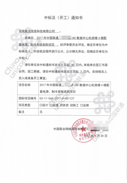【中标】河南紫光中标中国联通某省IDC数据中心电源、制冷工程项目