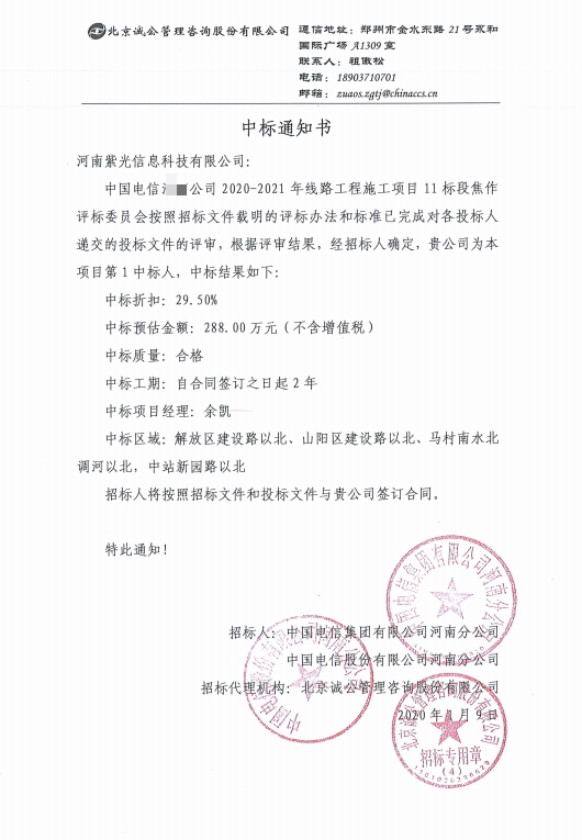 【喜讯】恭喜我司中标中国电信某省2021-2022年线路施工项目
